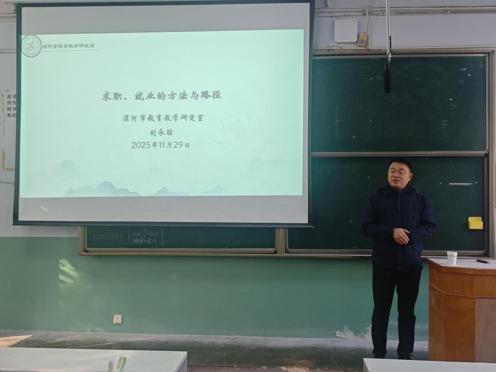 11月29日上午,太阳集团tyc46332004级校友、漯河市教育教学研究室地理教研员刘永胜于J2-T2教室为我校师生作了题为“求职、就业的方法与路径”的主题交流报告。刘老师结合自身从一线地理教师到教研员的成长经历,围绕地理教育现状、职业认同、深造与就业选择、入职前准备等方面展开分享,鼓励同学们尽早树立职业目标,注重教学能力与综合素养的双重提升,并就现场提问进行了细致解答。本次报告会为同学们提供了宝贵的就业指导与经验借鉴,进一步增强了学生的职业规划意识与从教信念。